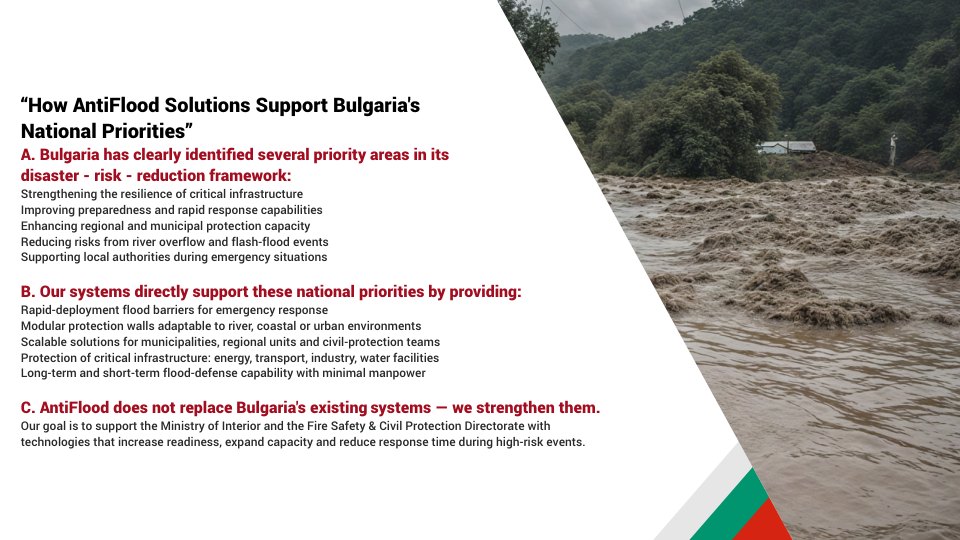 Η AntiFlood S.A. εκφράζει τις ευχαριστίες της προς τη διοίκηση και όλες τις συμμετέχουσες υπηρεσίες για την ευκαιρία που δόθηκε να παρουσιαστούν οι τεχνολογικές δυνατότητες της εταιρείας και να εξεταστούν προοπτικές συνεργασίας με σκοπό την ενίσχυση της εθνικής ανθεκτικότητας της Βουλγαρίας.